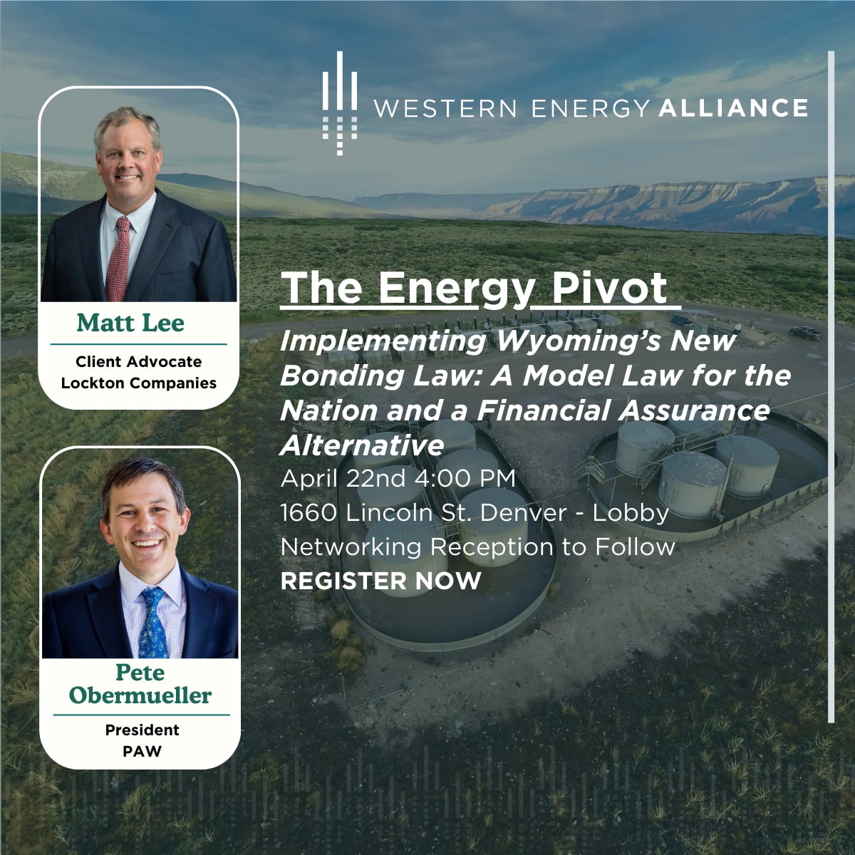 Our April Energy Pivot will feature the newly passed law in Wyoming that establishes a bonding pool in response to the excessive federal bonding requirements of the Biden administration. Pete Obermueller with the Petroleum Association of Wyoming will discuss the new law and the rulemaking process that’s implementing it. Matt Lee of Lockton Companies will discuss how the Wyoming law might serve as a model for the entire country and will present OneNexus, a unique financial assurance product that enables producers to meet their legacy obligations in a cost-efficient manner.